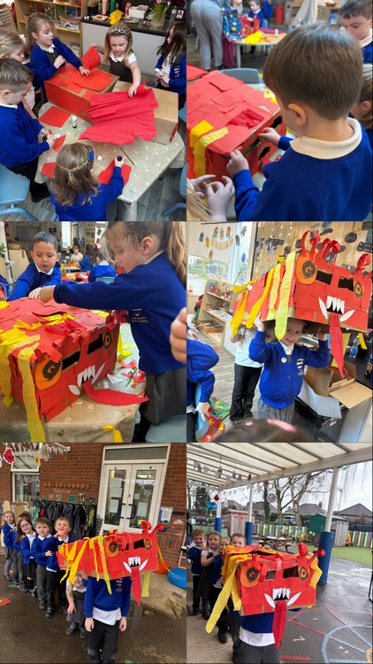 We turned our home corner into a Chinese cafรฉ ๐๐ฅข where the children enjoyed role play as chefs and customers. They made lanterns ๐ฎ, practised writing Hanzi, painted pink blossom trees ๐ธ and even created their very own dragon ๐.
