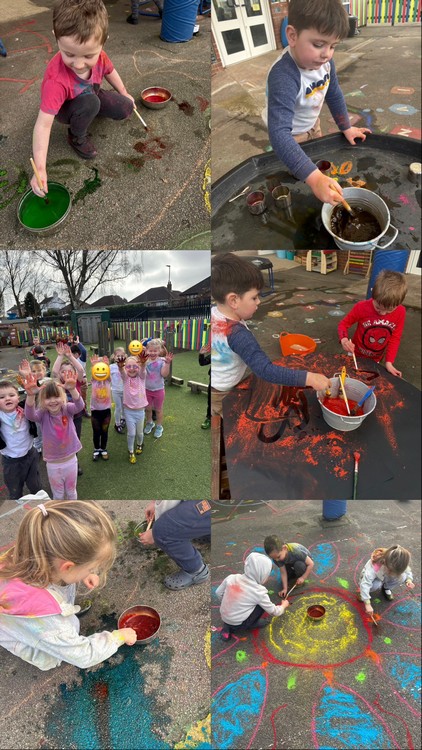 Of course, we celebrated by putting on our spare clothes and getting messy with bright Holi powder ๐จ The children had so much fun making each other super colourful and messy especially Miss Wilson.