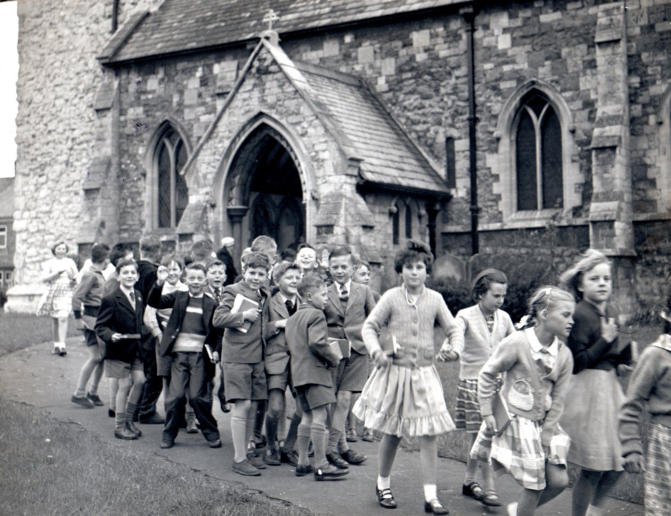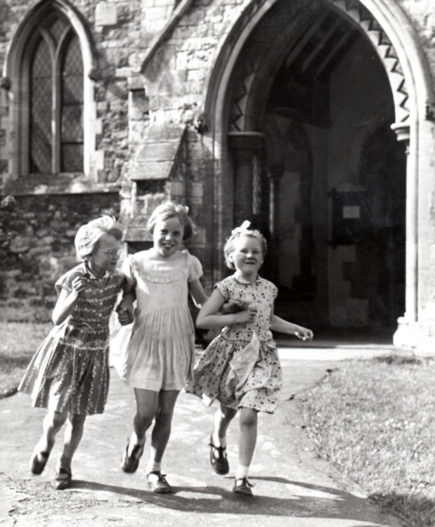 Three girls running out of church dated 1958/9.