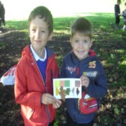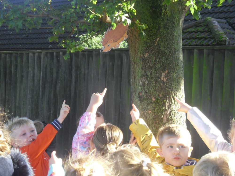 The sun shone as we put on our wellies and coats and set off in search of autumn animals. We looked in the trees and on the ground to find a spider, owl, squirrel, hedgehog, fox and a bat.