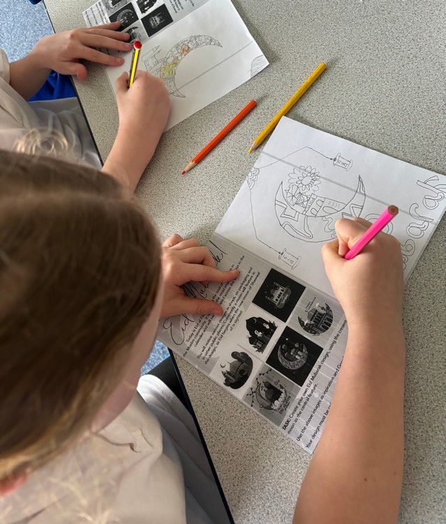 As part of our learning, the children explored key symbols linked to Eid, focusing on the crescent moon. They discovered how the sighting of the new moon signals the end of Ramadan and the beginning of Eid celebrations.