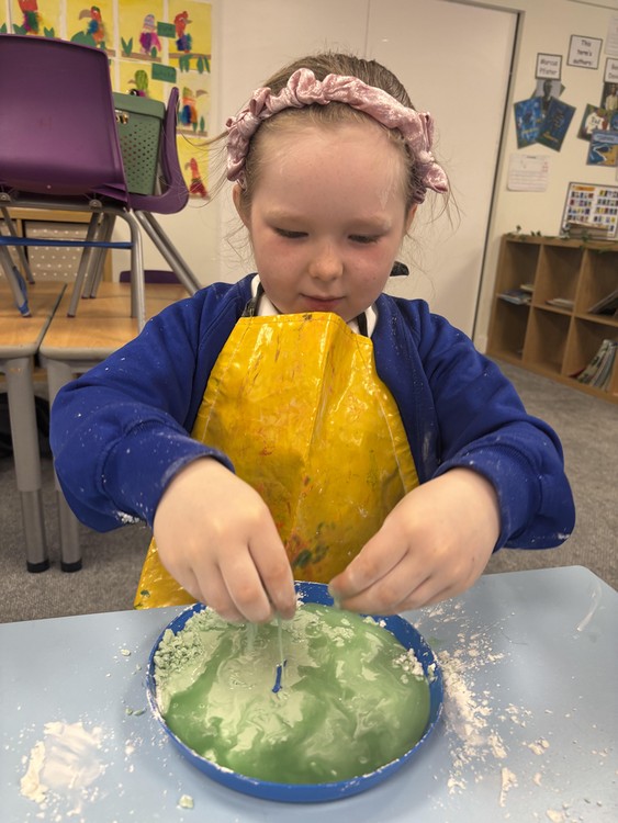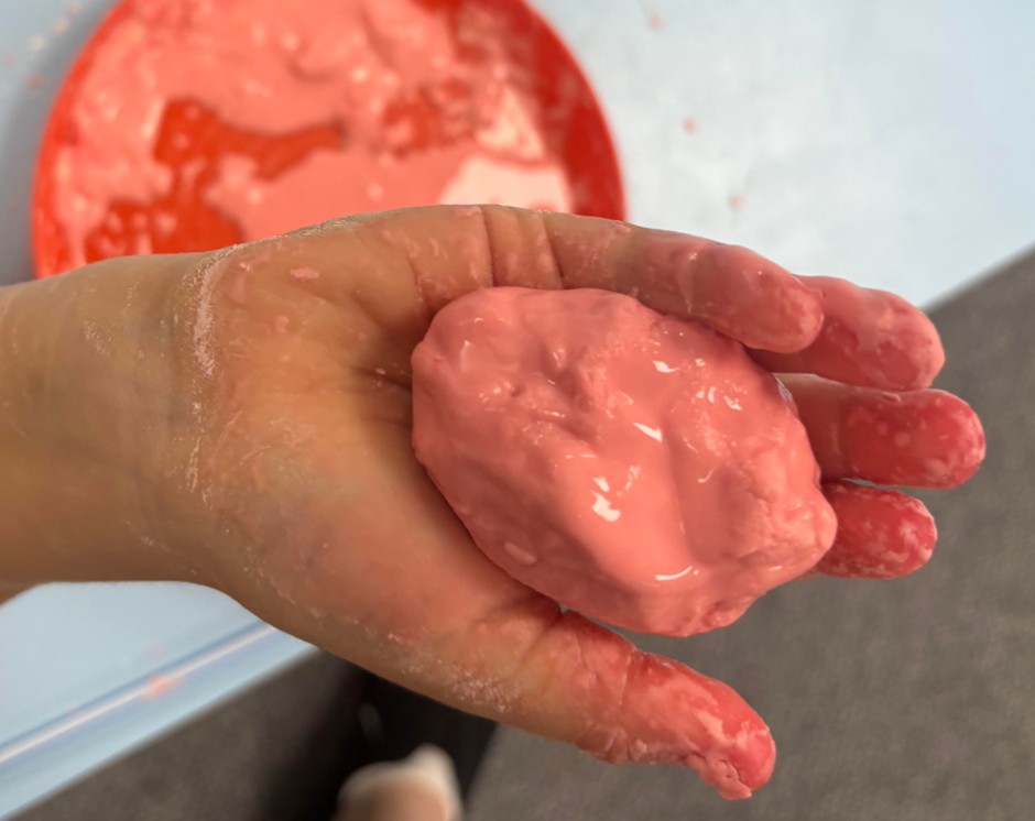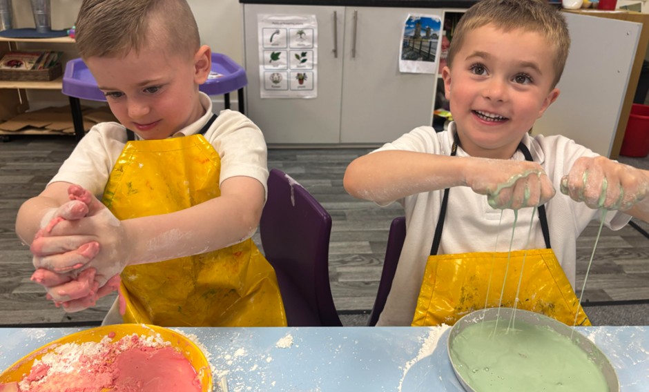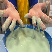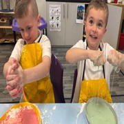 Our first ever Messy Science session was on Monday. Our scientists became "atom experts" by learning all about how atoms behave in solids and liquids. They discovered that atoms in a solid stand still and hug tight, while atoms in a liquid love to slip and slide past each other. To see this in action, the children mixed up a magical non-Newtonian fluid that acts like a shapeshifter; when they poked it hard and fast, it turned into a tough solid, but when they let it rest in their hands, it melted away like gooey slime! It was a brilliantly messy way to kick start our new messy science club!